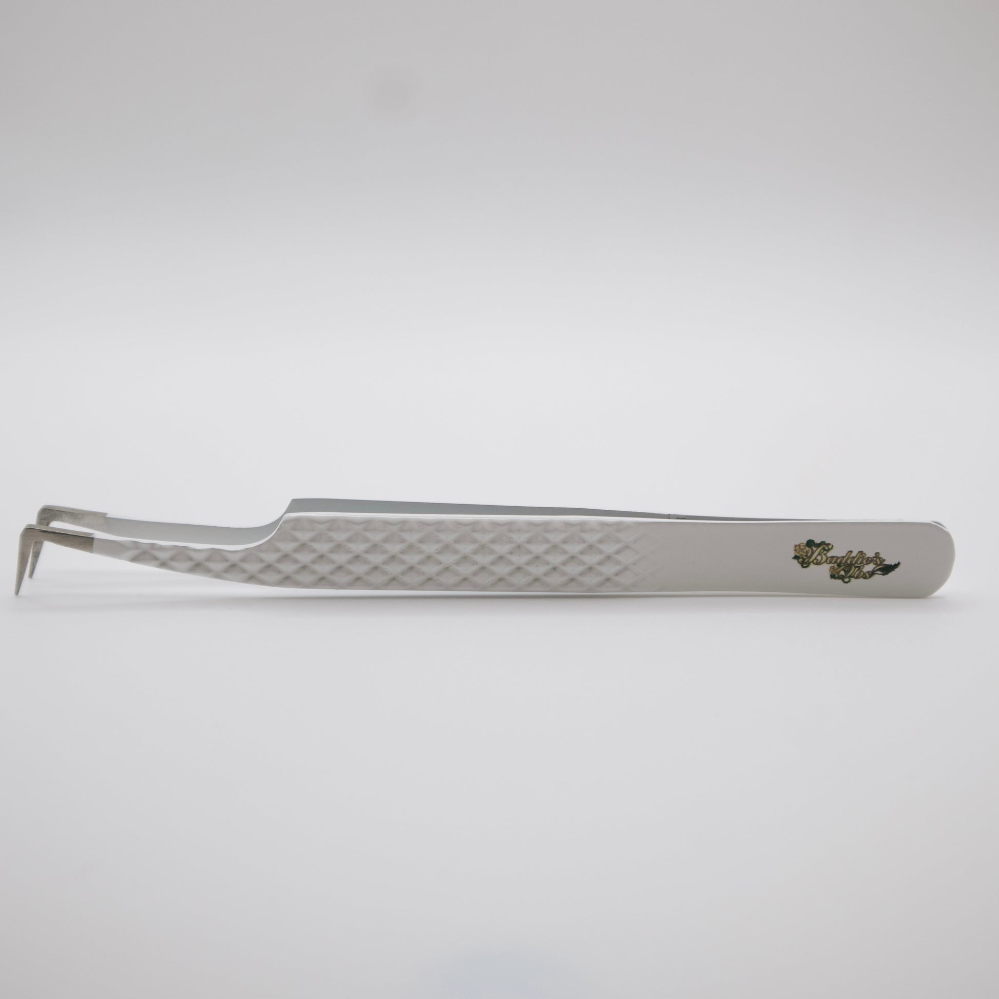 This tweezer has a 90 degree shape. Perfect when doing a volume set on client. Has more space to fan out.